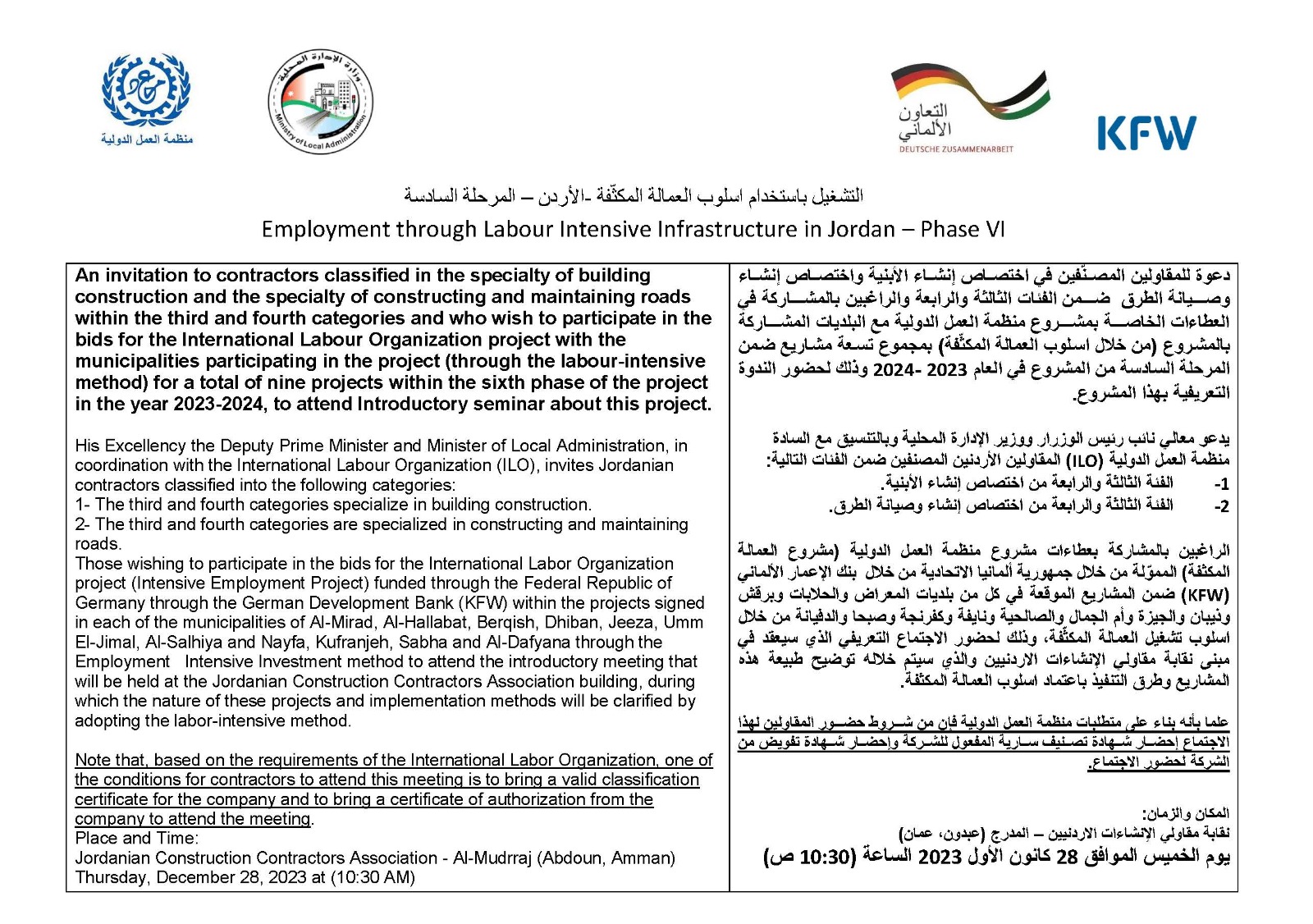 ●دعوة للمقاولين المصنّفين في اختصاص إنشاء الأبنية واختصاص إنشاء وصيانة الطرق  ضمن الفئات الثالثة والرابعة والراغبين بالمشاركة في العطاءات الخاصة بمشروع منظمة العمل الدولية مع البلديات المشاركة بالمشروع (من خلال اسلوب العمالة المكثّفة) بمجموع تسعة…
