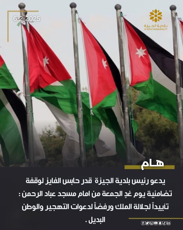 يدعو رئيس بلدية الجيزة" قدر حابس الفايز" لوقفة تضامنية يوم غد الجمعة من امام مسجد عباد الرحمن تأييدآ لجلالة الملك ورفضآ لدعوات التهجير والوطن البديل.